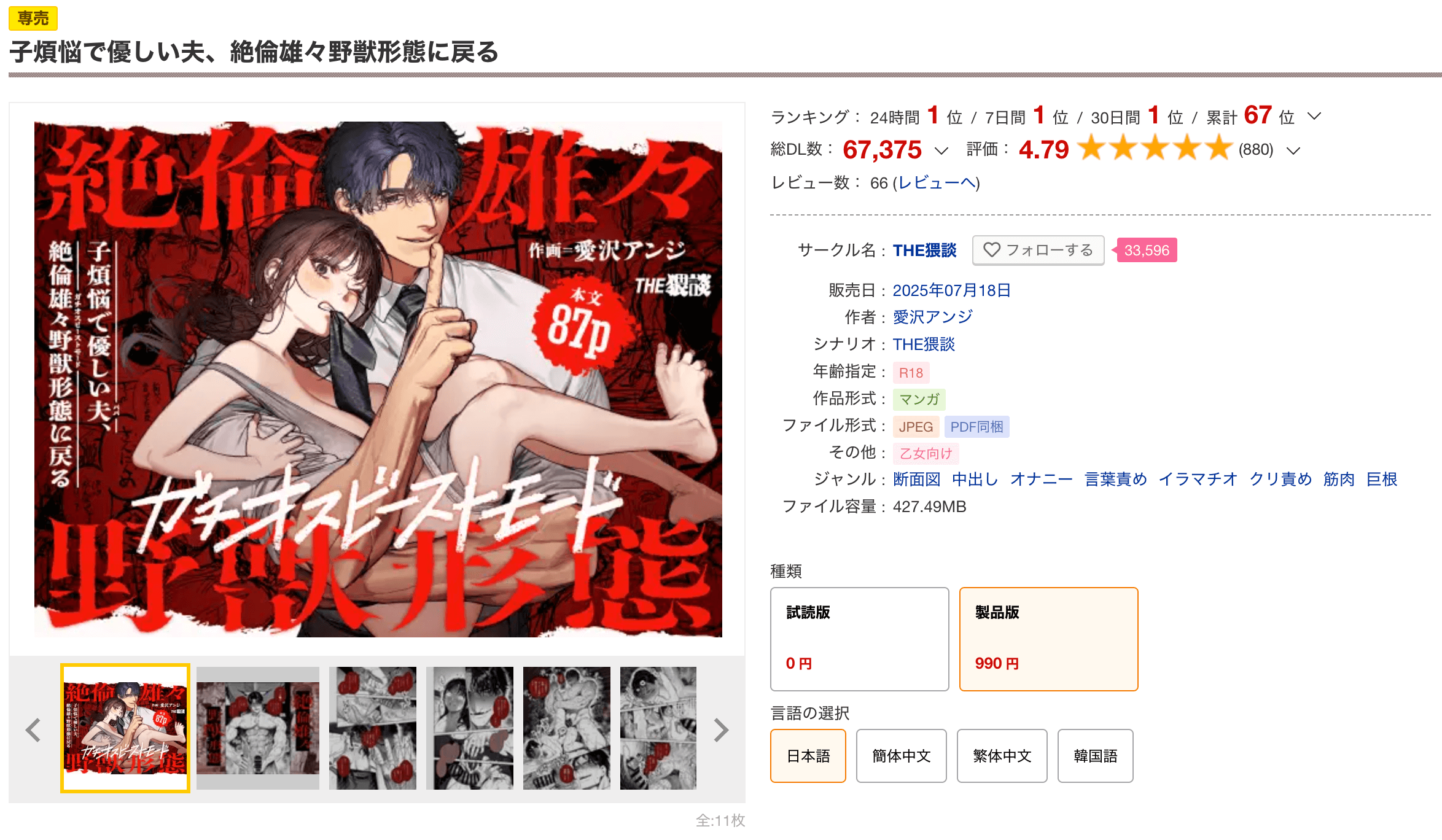 子煩悩で優しい夫、絶倫雄々野獣形態に戻るを読むならDLsiteで♪rawやhitomiはNG!